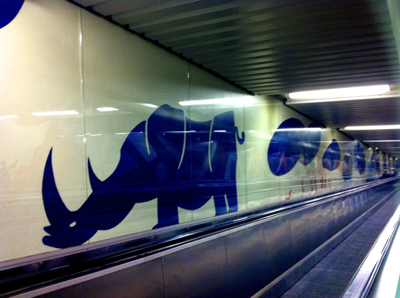 Above is the 125 meter hallway, there are rolling platforms on each side, I walked up the center to take photos from each side, the plaque said that these 'playful forms, where a plane becomes a rhino, and people dance is to 'posture' us' as we roll by.